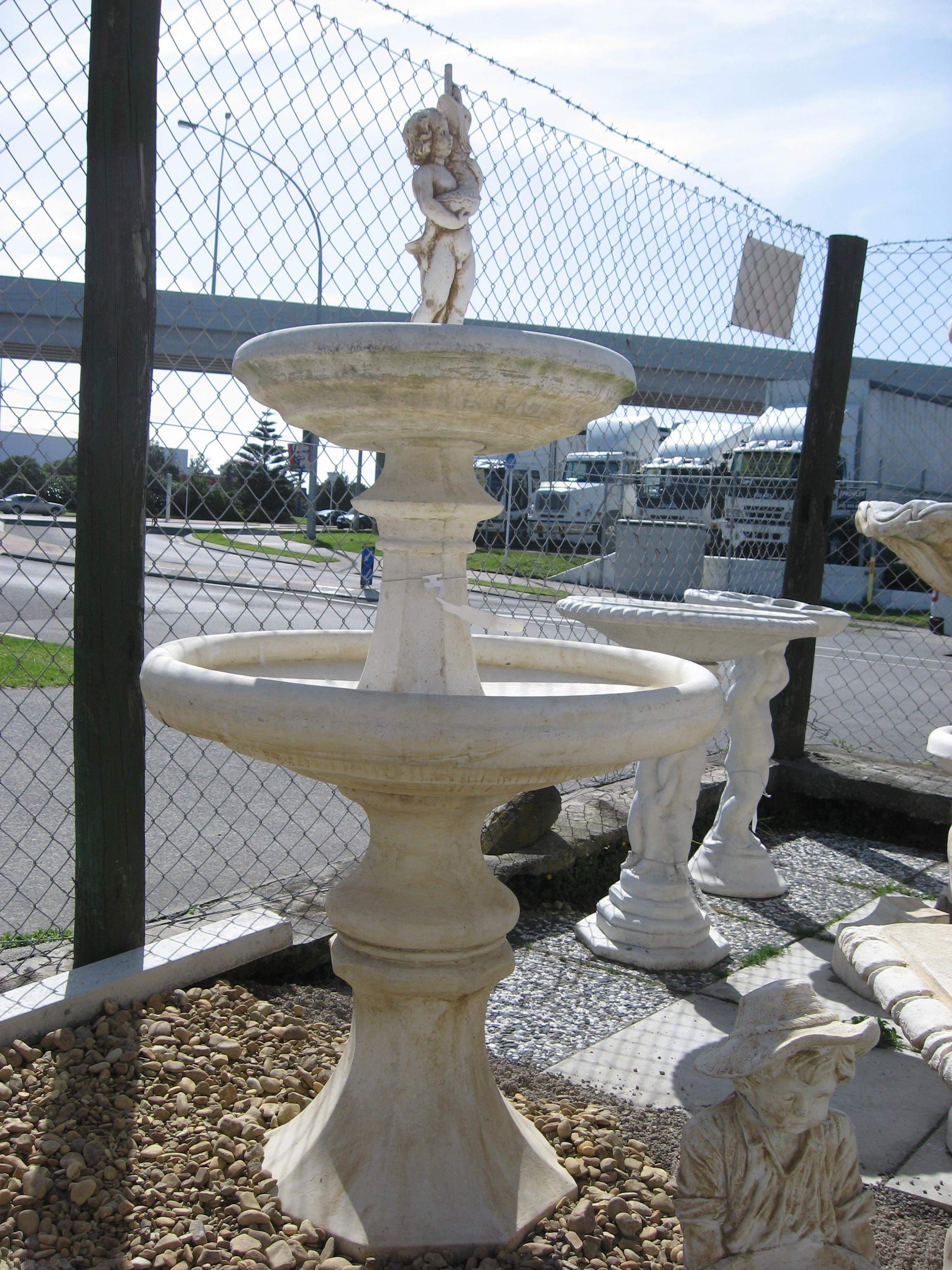 Charming solid concrete two tiered fountain* as shown in photo with cherub holding fish spout.