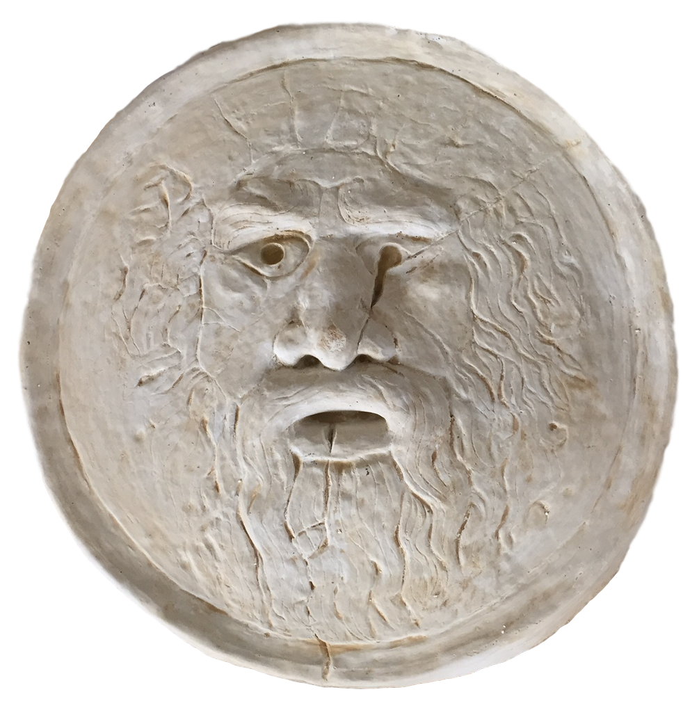This sculpture is a portrayal of the original image of La Bocca della Verita (Mouth of Truth), an ancient stone mask from the Classical period that represents a river god with an open mouth, wide eyes and a flowing mane of hair. The original is located in the portico of the church of Santa Maria in Cosmedin, Rome, Italy.